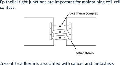 At the center of this critical process for transforming benign cells into carcinomas, is the protein Epithelial Cadherin, or E-Cadherin. In normal cells, E-cadherin is located in the membrane and involved in maintaining cell to cell contact, which is critical to normal function and structure of epithelial tissues. The individual E-Cadherin molecules are attached to the actin (scaffolding, or cytoskeleton structure) within the cell, anchored by β-catenin, a protein which helps form the junction between epithelial cells. As well as forming an anchor between epithelial cells, β-catenin is also involved in gene transcription, a process by which DNA (deoxyribose nucleic acid) is converted into RNA (ribose nucleic acid) within the nucleus of a cell for the purpose of producing new proteins normally associated with routine cell function.