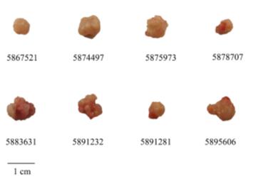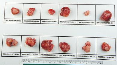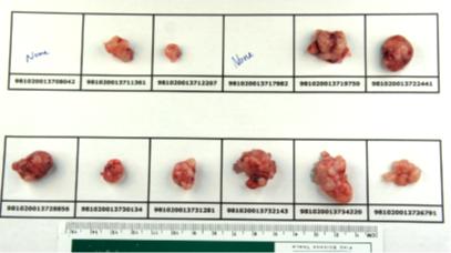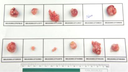 Photographs of excised tumors taken from mice on the final day of each study to assess anti-tumor efficacy of PRP are shown below.