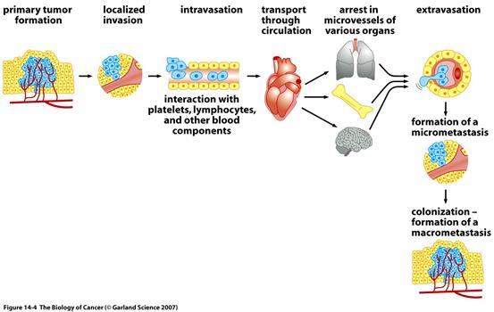 As dangerous and threatening as these primary tumors are, they are ultimately responsible for only about 10% of deaths. A far greater threat often arises for the patient, even after a primary tumor has been identified and removed. This threat involves cancerous growths that are discovered at sites far removed from the locations in their bodies where their primary tumors first appeared. These cancerous growths, called metastases, are responsible for approximately 90% of patient deaths from cancer. Metastases are formed by cancer cells that have left the primary tumor mass and traveled by the body’s blood and lymphatic vessels (a vein-like vessel carrying lymph, or white blood cells, from the tissues) to seek new sites and form new colonies. For example, breast cancers often spawn metastatic colonies in many tissues throughout the body including the brain, liver, bones, and lungs.